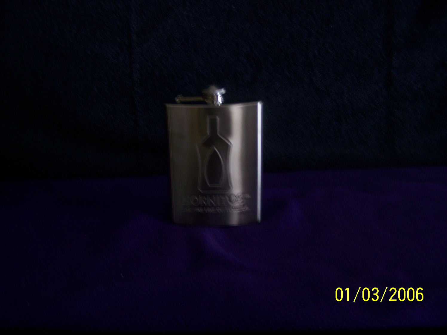 This tin flask is a collectible from Hornitos, a fine,100% blue agave tequila made by the Sauza distillery. It is displayed in the B.L.A.S.T.Museum Hall, ‘Straight Up’, along with an accompanying Hornitos decanter.